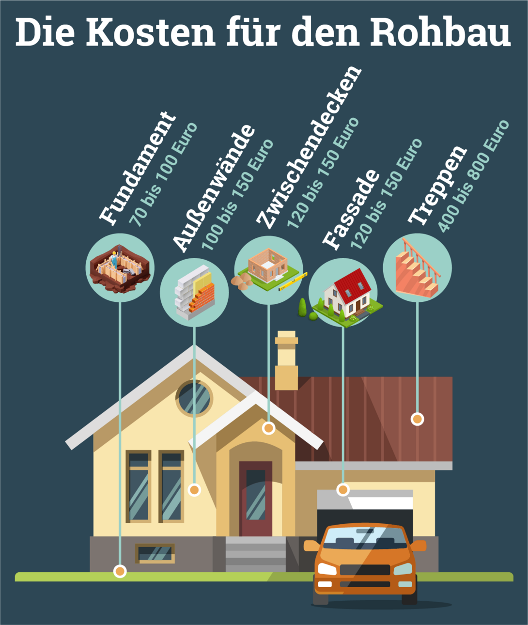 Alle Bauarbeiten, die zur Erstellung von Fundament, Außenwänden, tragenden Wänden und Dach benötigt werden, gehören zum Rohbau. Einsparpotenziale für Bauherren bieten sich hier insbesondere bei den verwendeten Materialien. So sind altbewährte Baustoffe wie Ziegel oder Kalksandstein günstiger als Fachwerkwände oder Waschbeton. Die Kosten im Überblick: