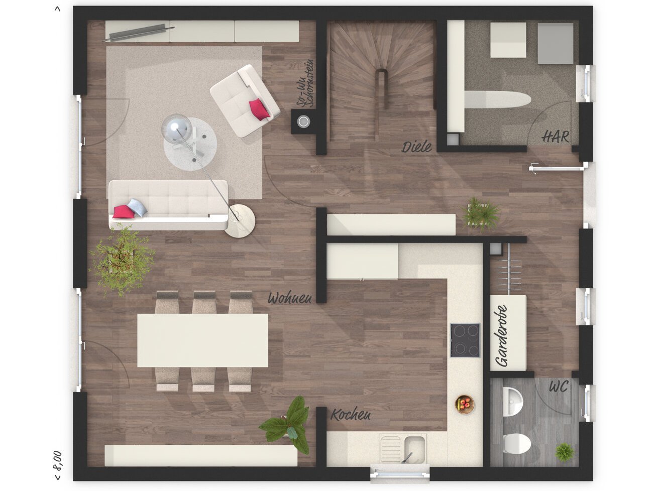 Das kleine Haus "Raumwunder 100" macht seinem Namen alle Ehre! Auf rund 70 Quadratmetern Grundfläche erhalten Sie 99 Quadratmeter Wohnfläche, die sich sehen lassen können. Angefangen beim lichtdurchfluteten Wohnbereich über gemütlicher Essecke bis hin zu Ihren Rückzugsorten im Dachgeschoss.